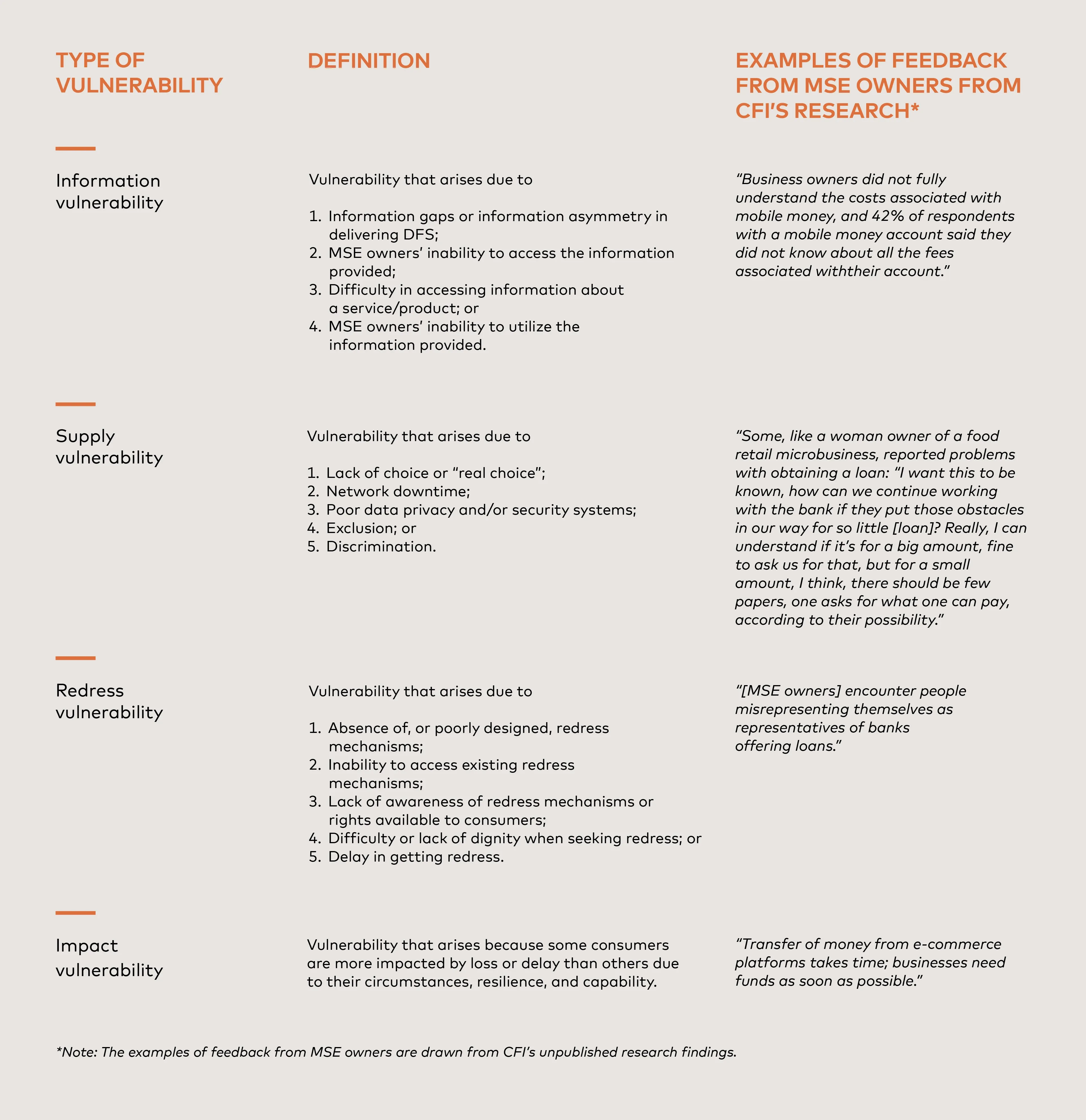 Small business owners also tend to be concerned about business continuity. This need for stability and continuity extends to the financial services providers they choose to transact with. DFS providers are seen as fickle; the belief among MSE owners is that they can disappear overnight and are not as well-regulated as banks and non-digital nonbank financial institutions. These issues either create new vulnerabilities or exacerbate existing ones, contributing to the trust deficit displayed by small businesses. CFI uses a vulnerability framework to identify drivers of consumer protection risks for micro- and small businesses using qualitative evidence available from various studies.