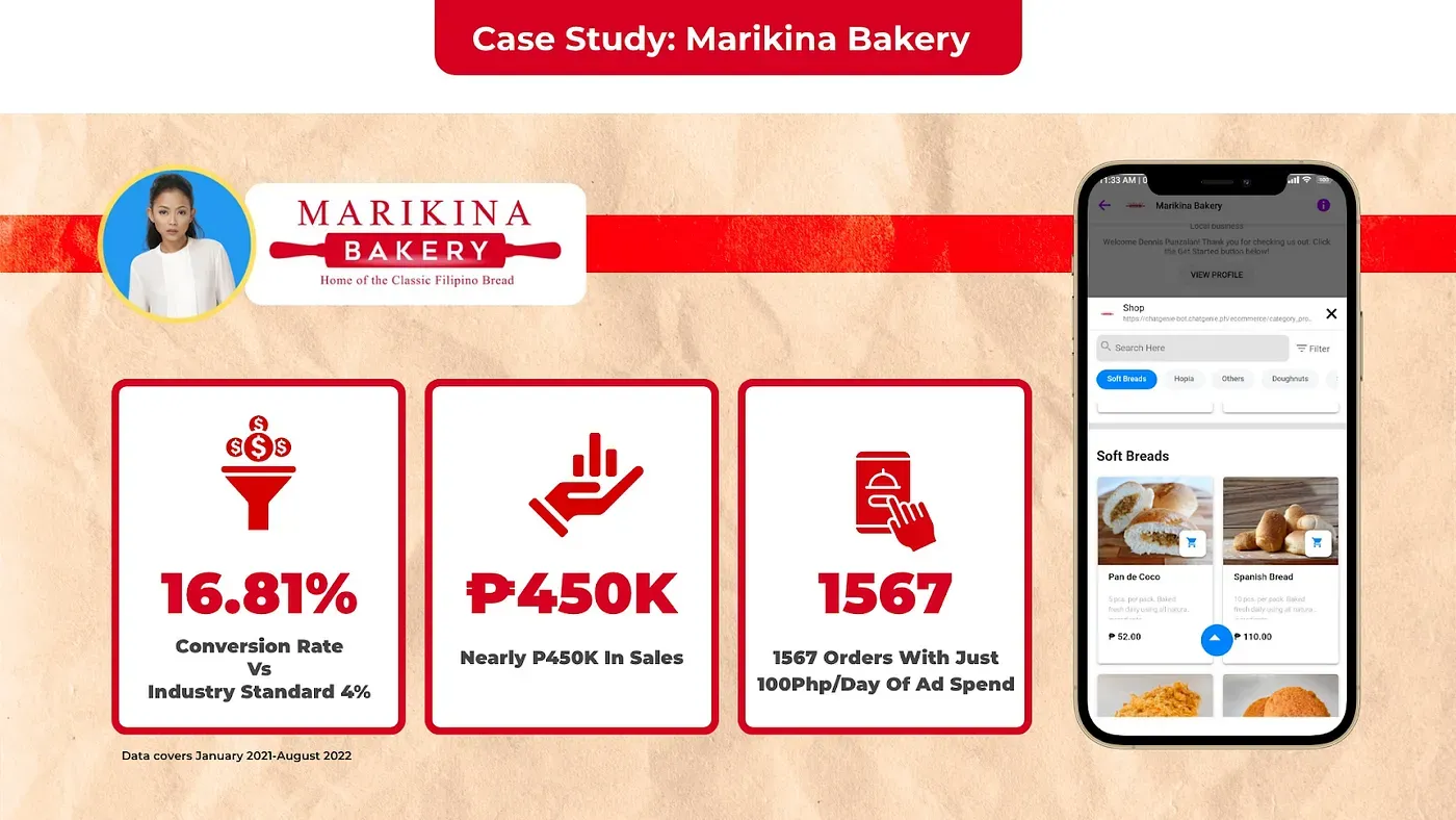 Our main goal is to equip small businesses with tools to transition from traditional brick-and-mortar sales to social commerce and maximize their opportunities amid the competitive landscape of e-commerce. Family-run businesses like Marikina Bakery can make the most out of social selling with the ChatGenie platform and optimized social media strategies like Facebook ads. For Marikina Bakery, the use of this platform resulted in an average customer conversion rate of 16.81%, in contrast to the industry standard rate of 4%.