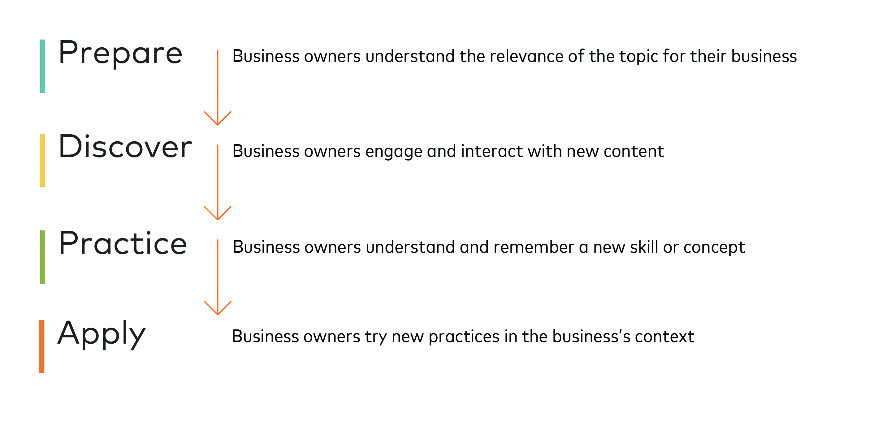 In recognition of how busy most small business owners are, this content is brief and actionable, focusing on “quick wins”. Templates and tools at the end of each module enable users to immediately apply lessons to their own businesses. During prototyping, this was found to be one of the most useful parts of the course for business owners.